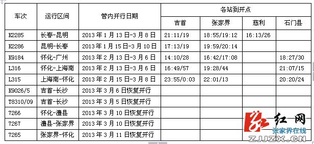 3月2日,从张家界火车站获悉,春运过后,车站短途列车将有3.5对列车恢复运行,分别为吉首至长沙K9026/5次,2013年3月6日恢复开行;吉首至长沙的T8310/09次,2013年3月5日恢复开行;怀化至澧县至张家界的7266/7次,2013年3月10日恢复开行;张家界至怀化的7265次,2013年3月11日恢复开行。